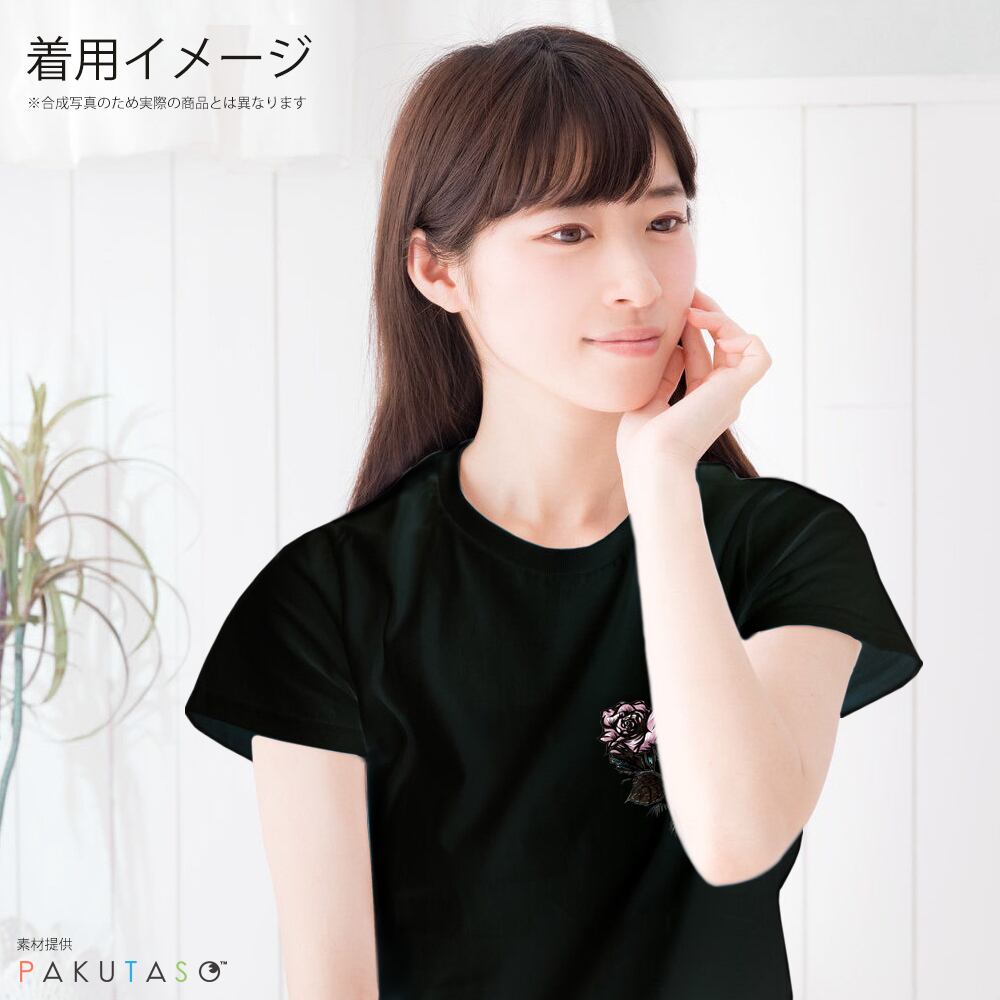 左胸にワンポイントの薔薇の絵が描かれたミノミノ画伯のシンプルなTシャツ。
