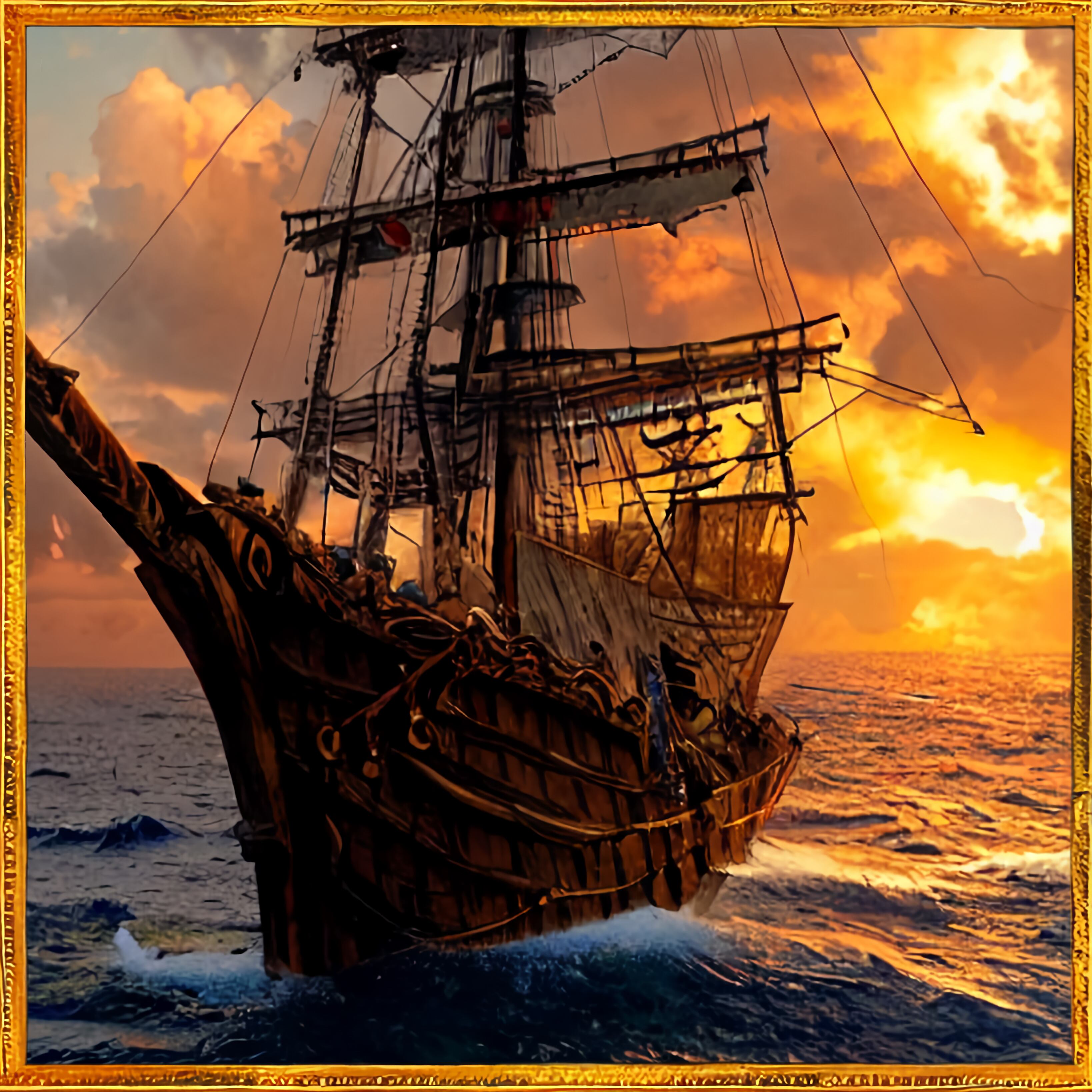 夕日に照らされながら力強く航行する帆船。