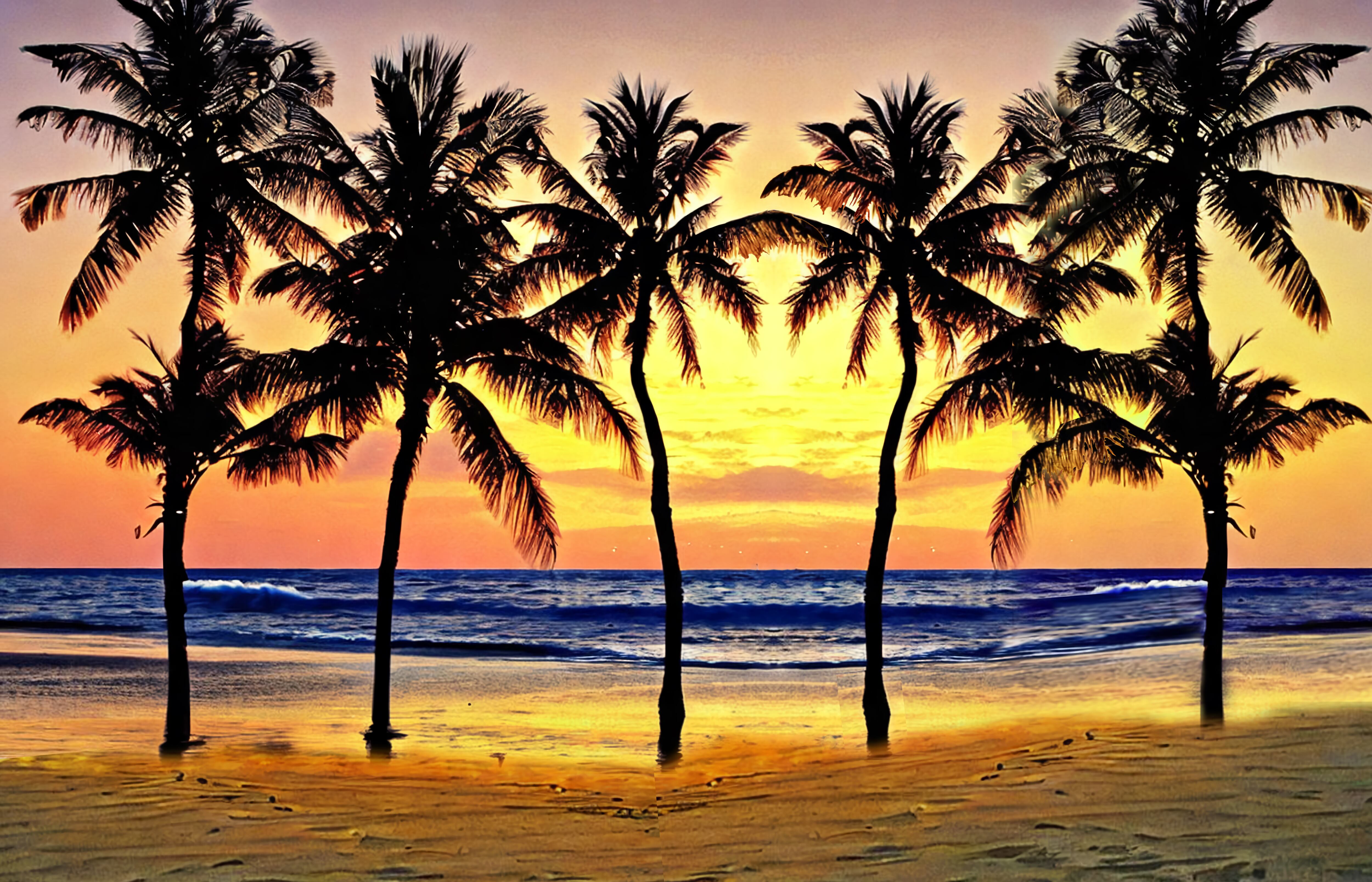 美しい夕焼けのグラデーションと、ヤシの木のシルエットが魅力的です。