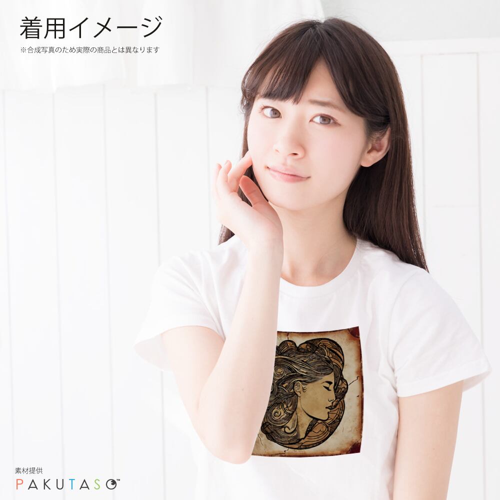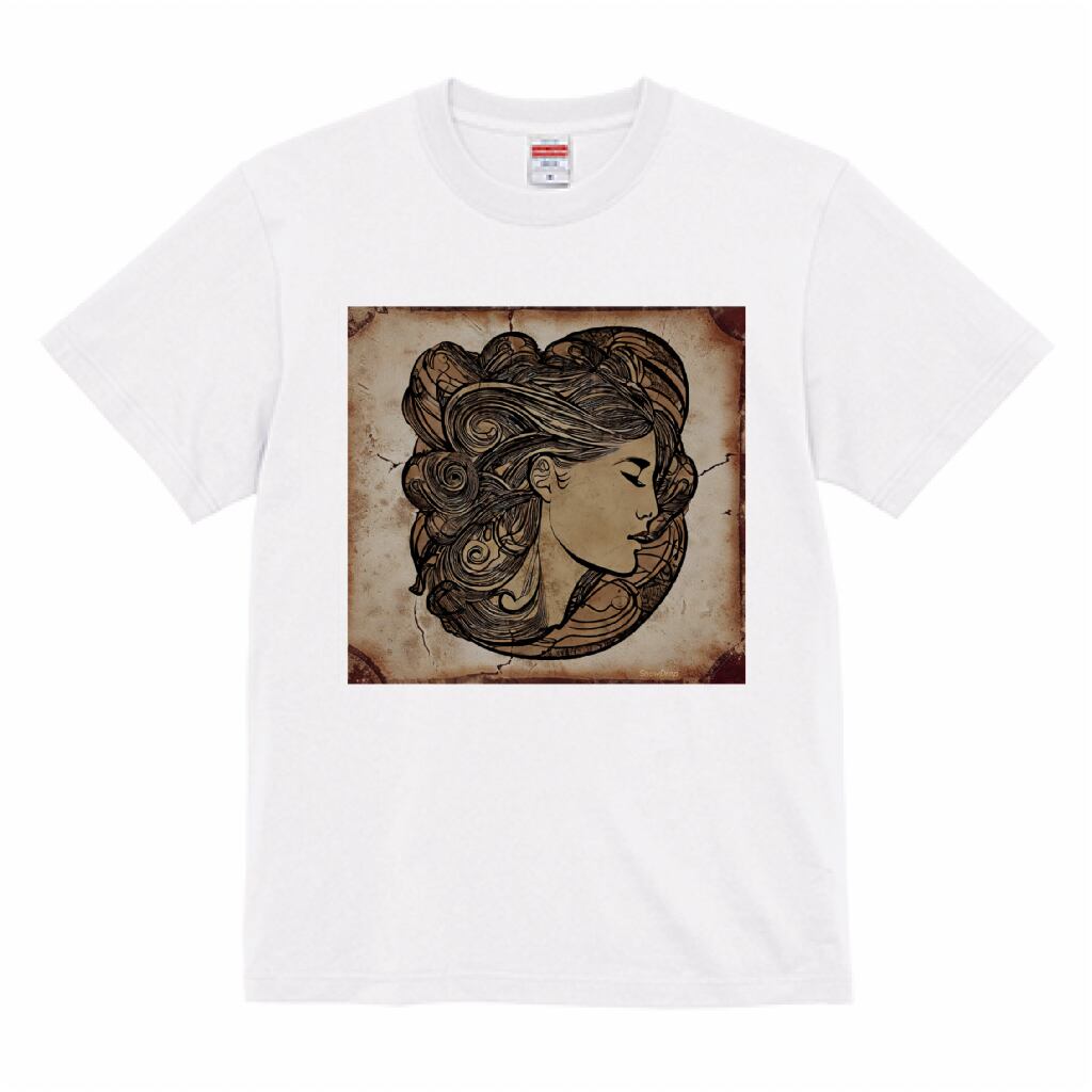 古い羊皮紙に描かれたような風合いで、神秘的で美しい女神の横顔が描かれたTシャツです。