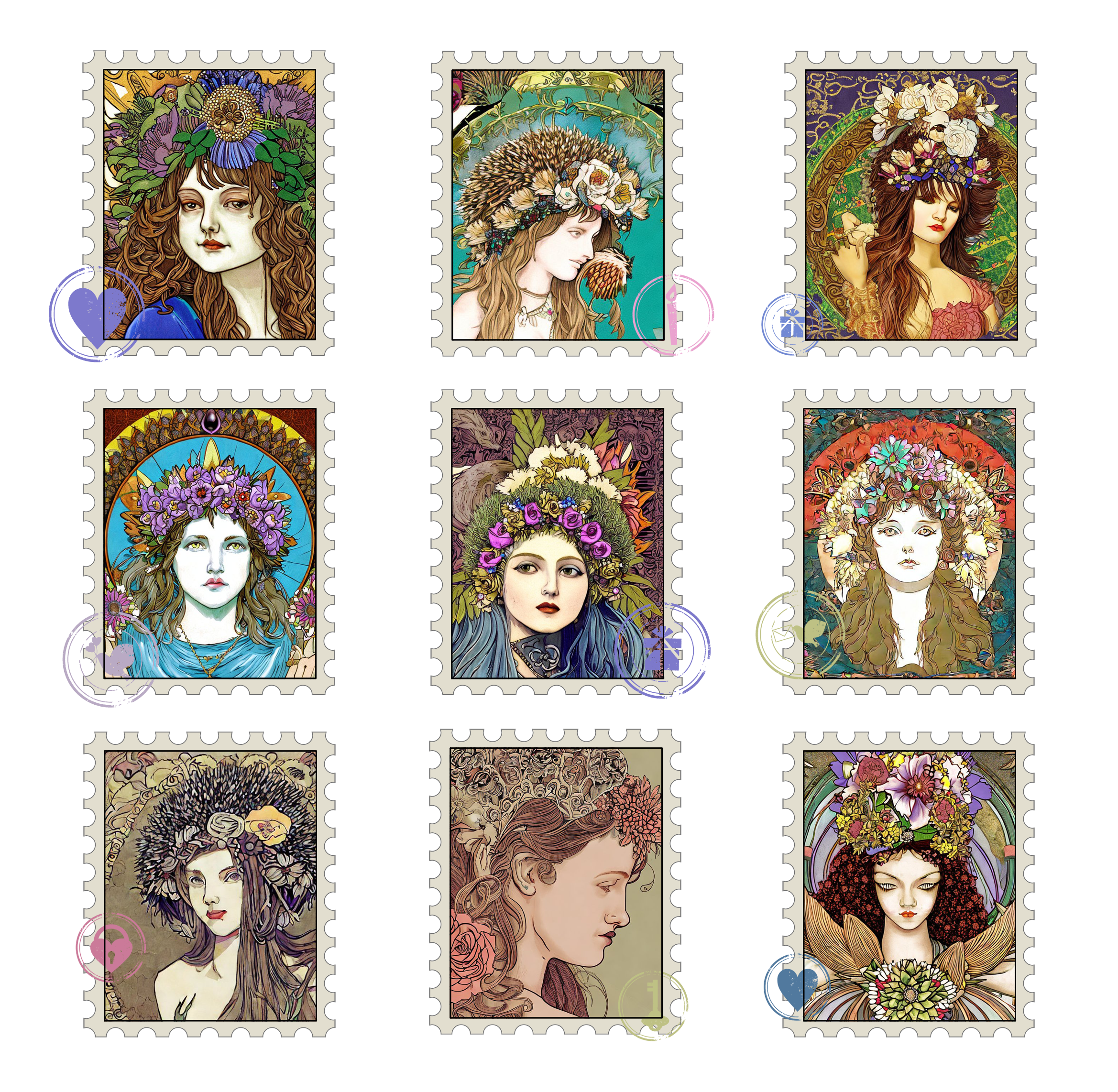 “女神”がテーマの切手調デザインで、神秘的な雰囲気を演出。