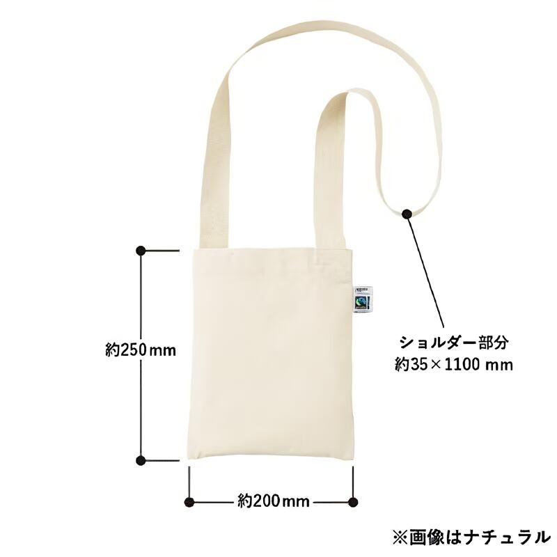 国際フェアトレード認証ラベル付きの地球にやさしいサコッシュ。